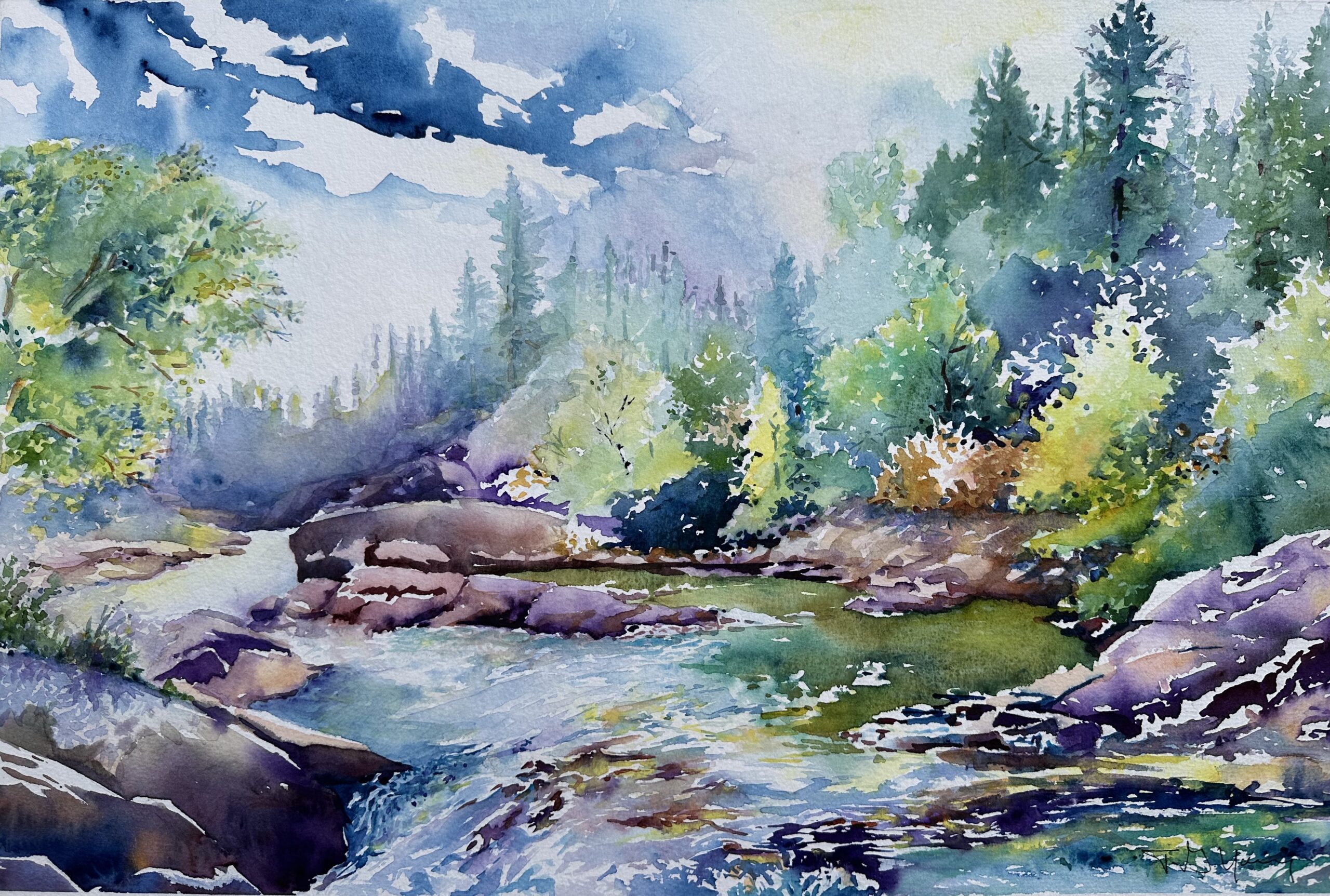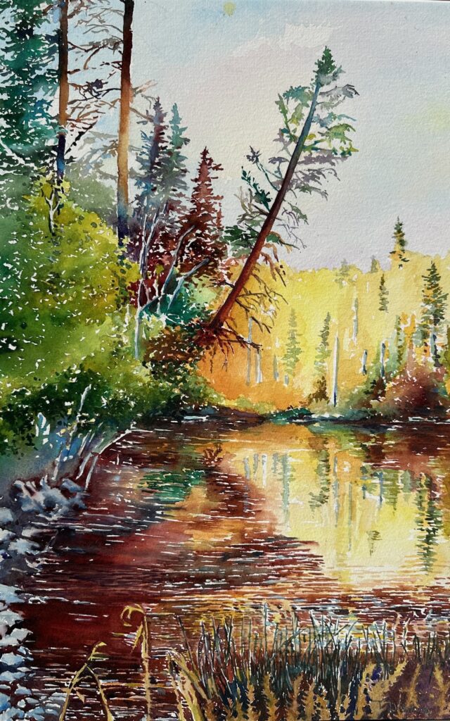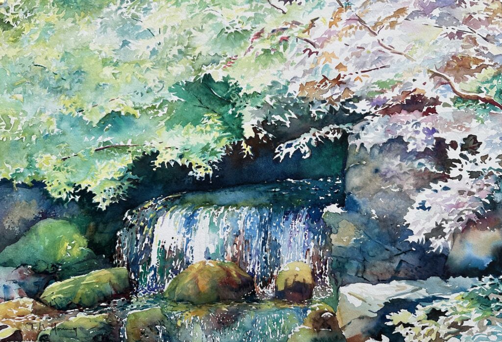 Tom’s expressive interpretation of the natural landscaped the water’s edge have been the subject of many of his watercolours. His interests in bonsai, Japanese gardening, and urban scape also provide subjects for his paintings.